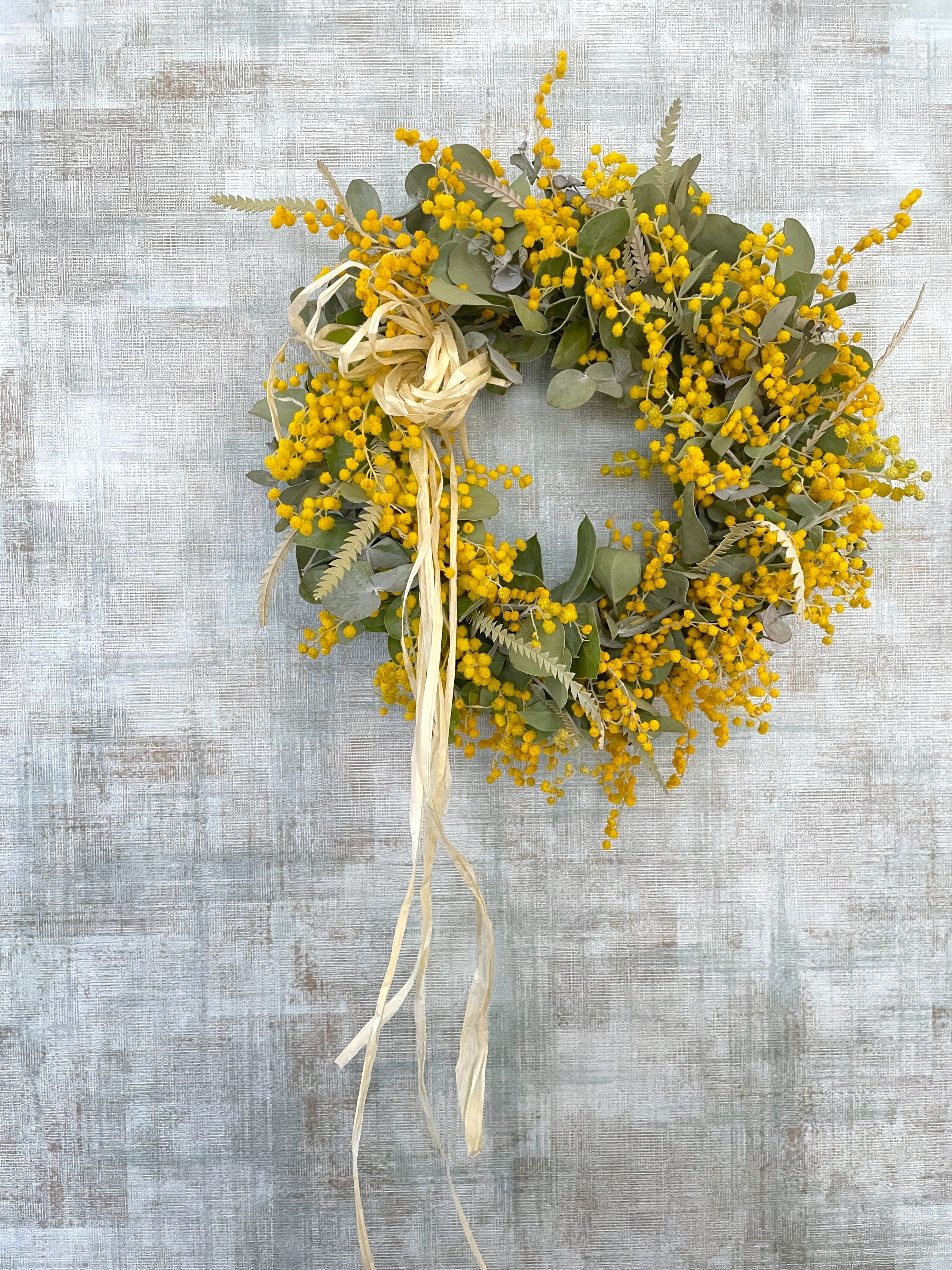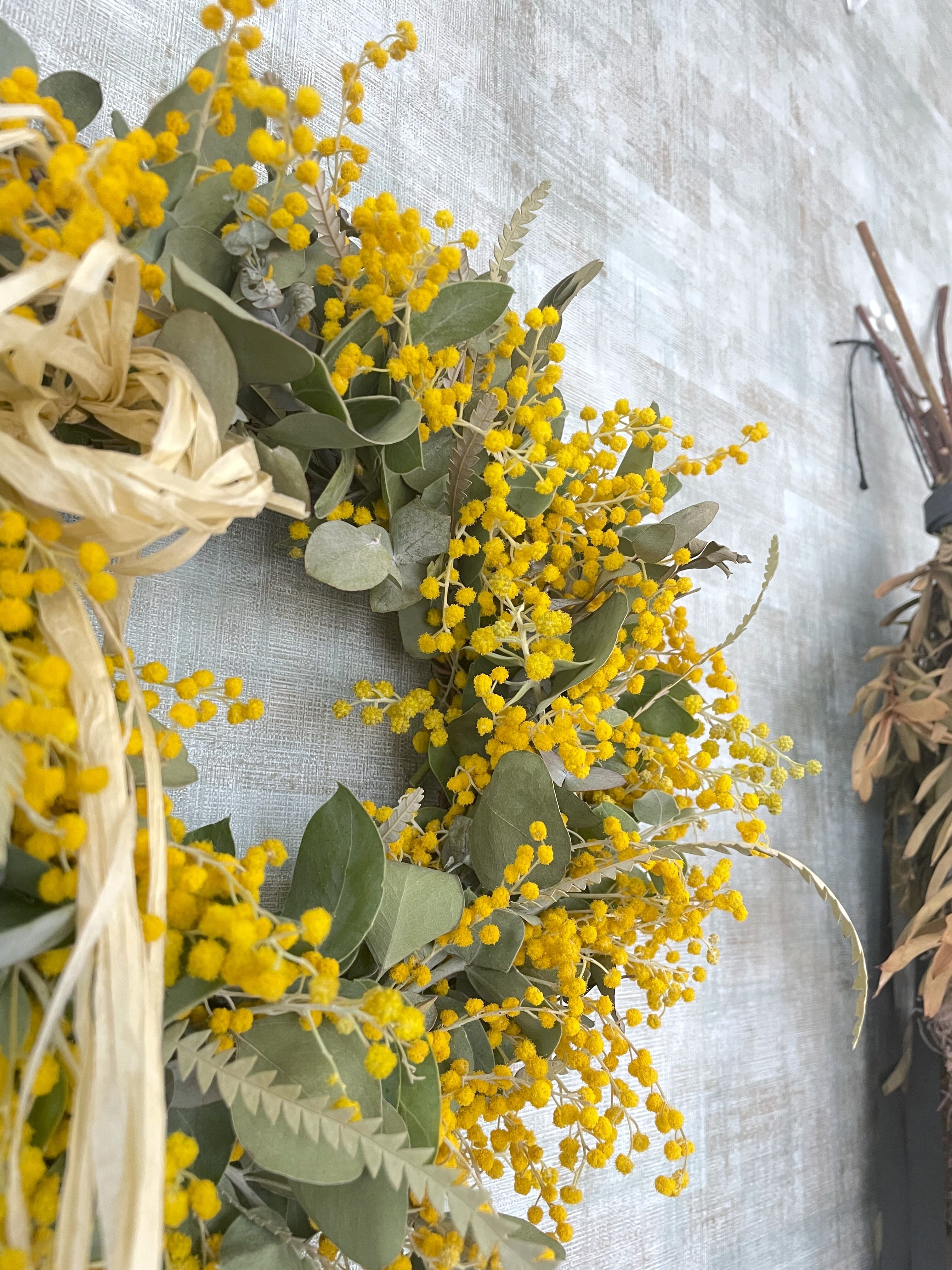 フレッシュなミモザを贅沢にあしらい、3種類のユーカリ、ドライアンドラの葉を合わせたハーフリースです。
