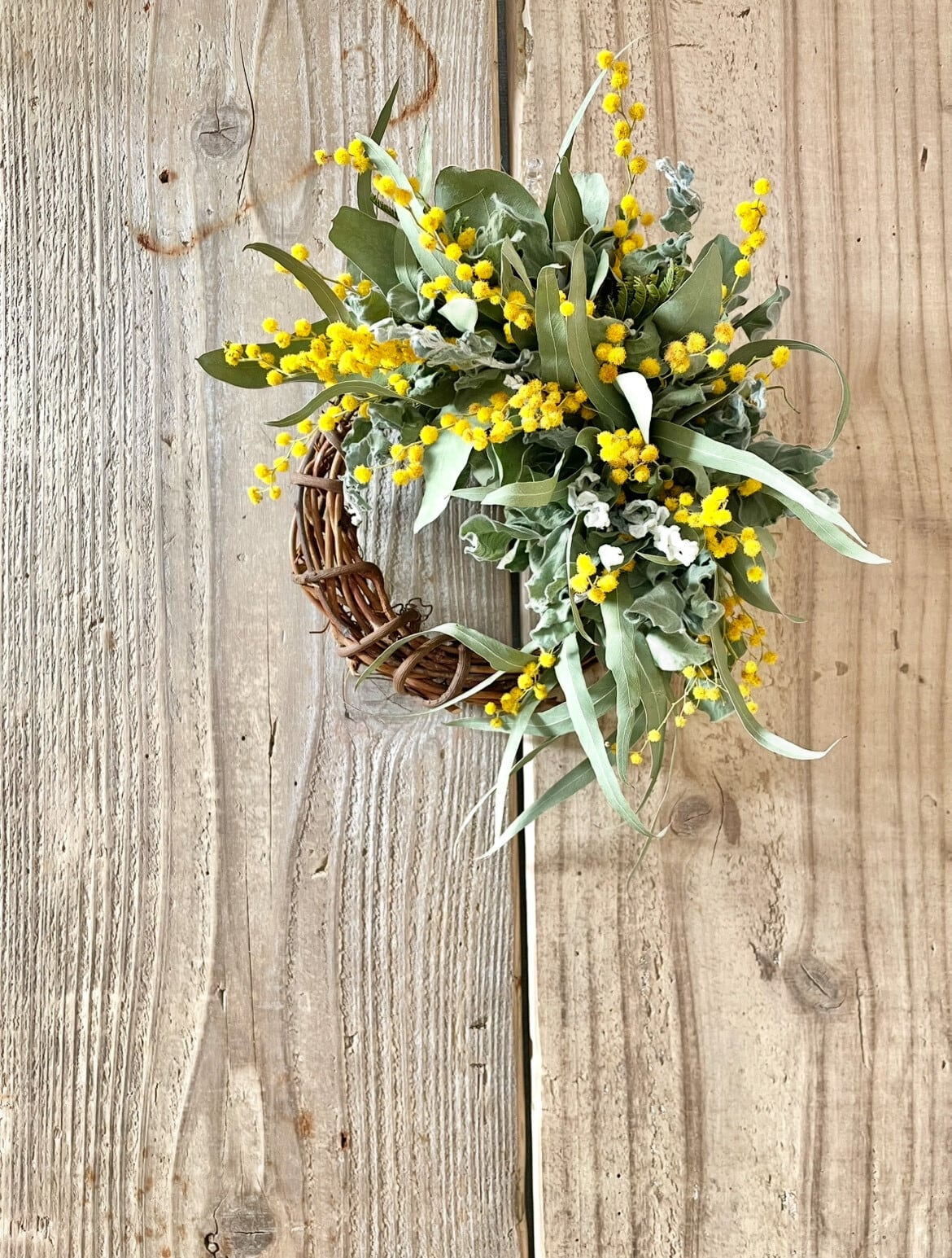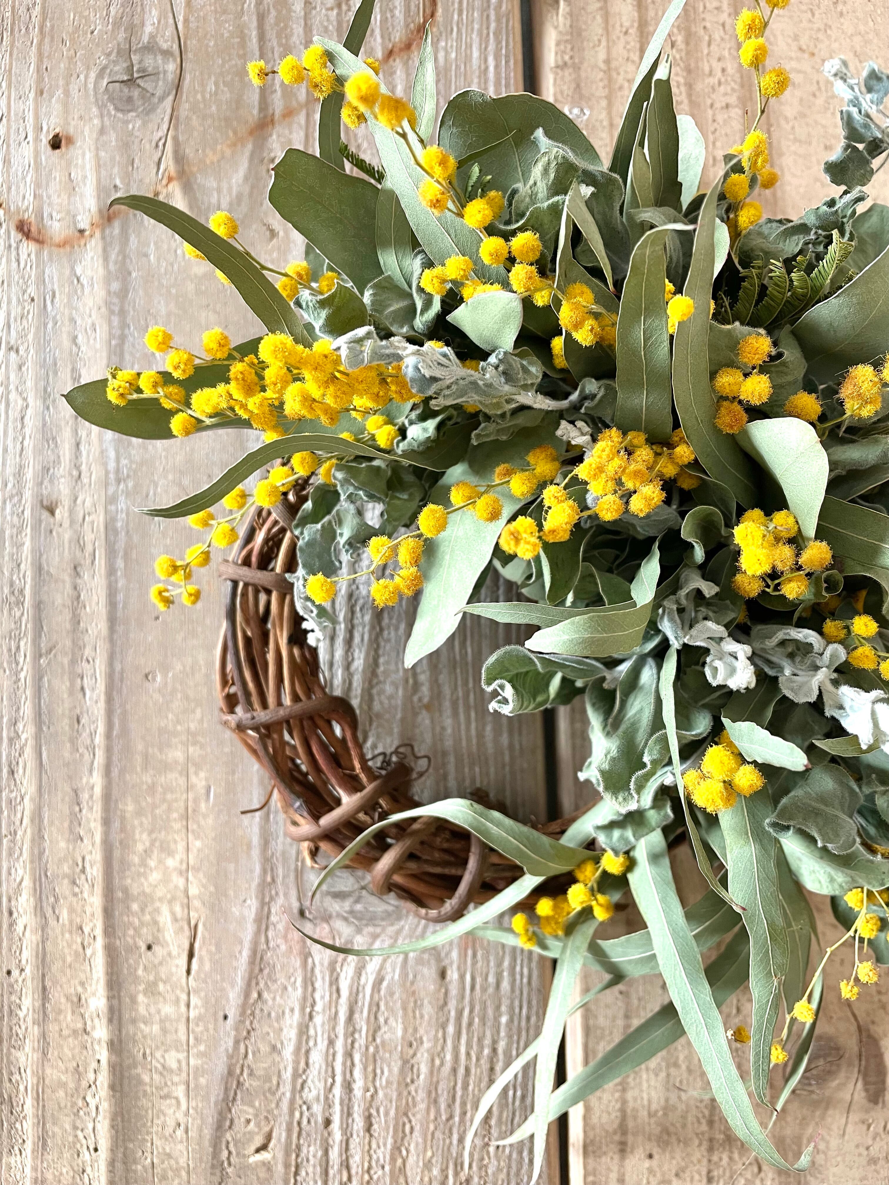生花のミモザとユーカリで作るハーフリースです。