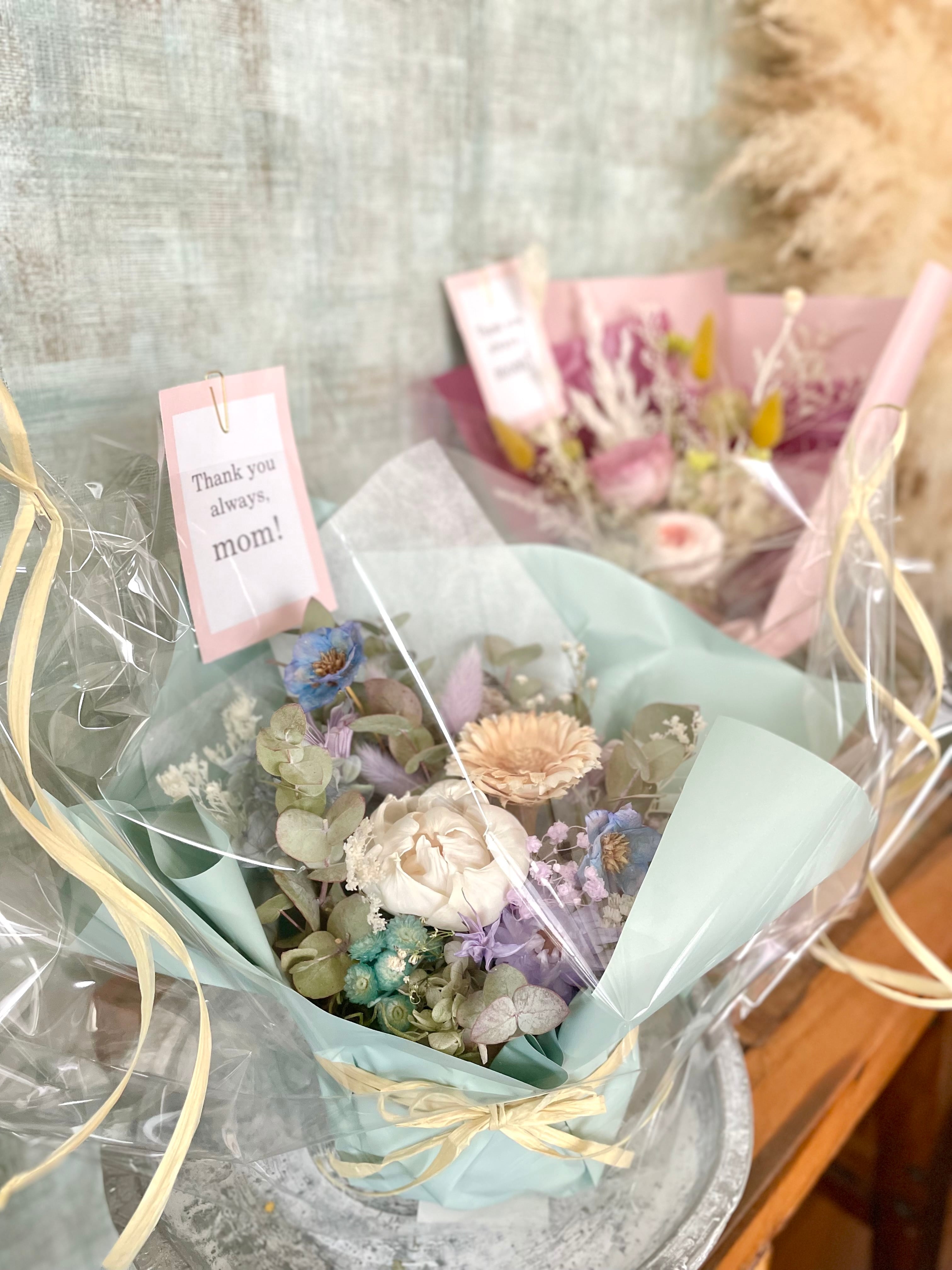 ドライフラワーはお手入れの手間もなく、飾りやすいサイズ感なので、お部屋に馴染んで長く飾っていただけます。送り主さまの「ありがとう」の気持ちもお母さまへ長く伝えることができます⚘