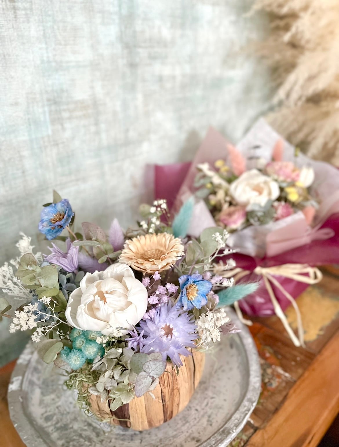 ドライフラワーとプリザーブドフラワーのかわいいバスケットアレンジは、思いやりのこもった素敵なプレゼントに。