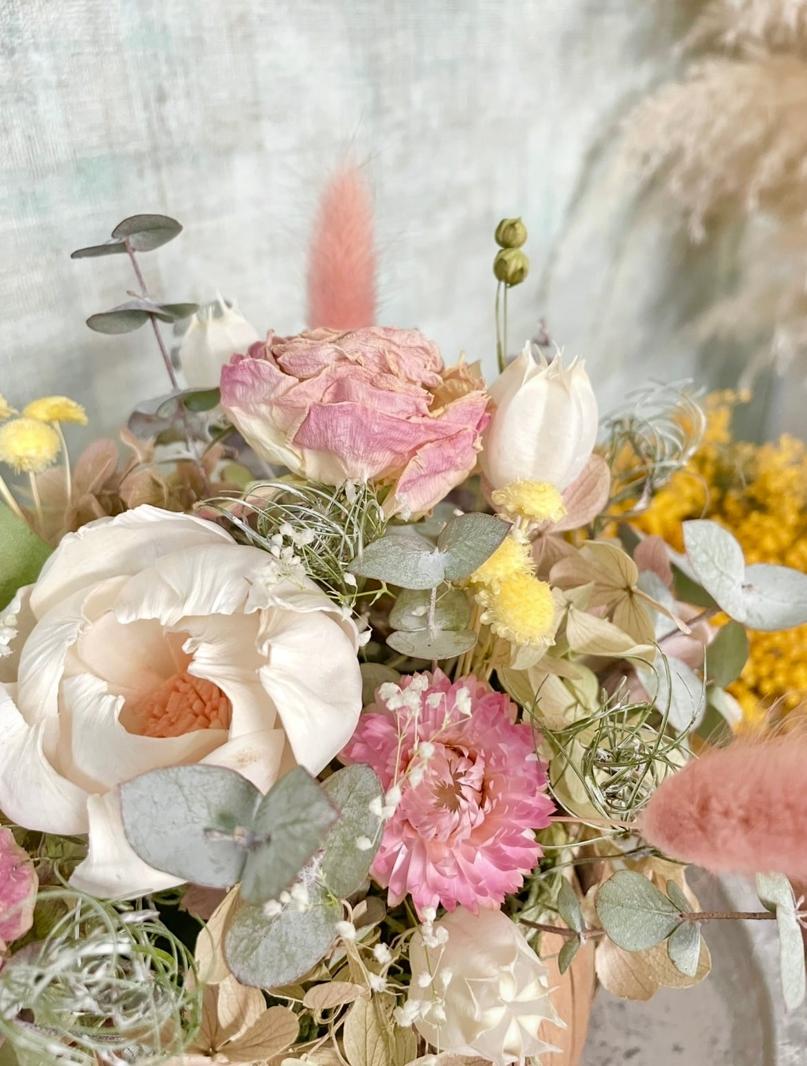 丁寧にドライアップした、自家製の淡いピンクのラナンキュラスと、ソーラーフラワーのピオニーが主役。プリザーブドフラワーのアジサイと、良い香りのユーカリや様々なドライフラワーを贅沢にたっぷりと、華やかに仕上げました。ぴょんと飛び出す小花や葉が楽しいアレンジです。